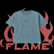 Blue t-shirt with a red logo on a black background with flame graphics